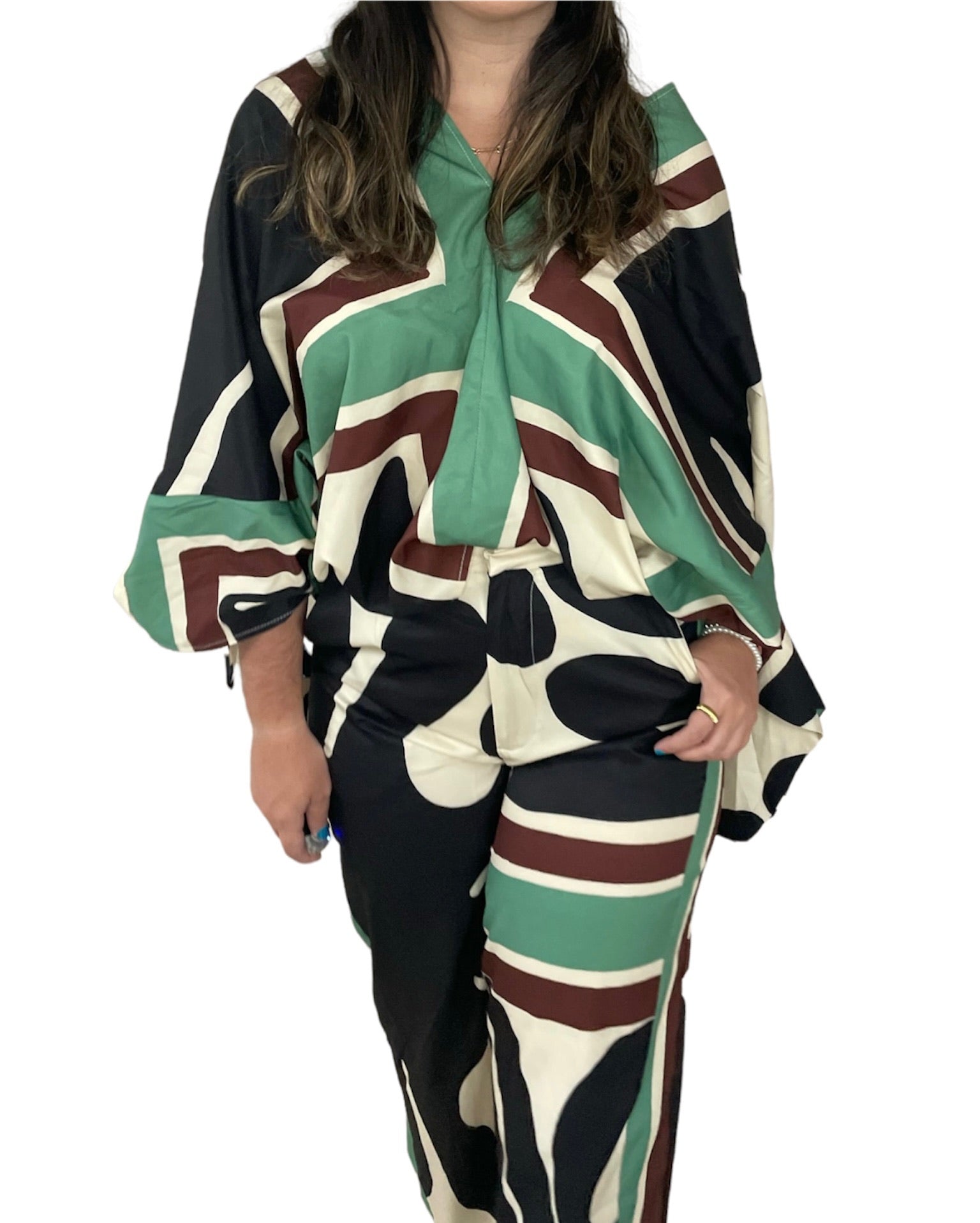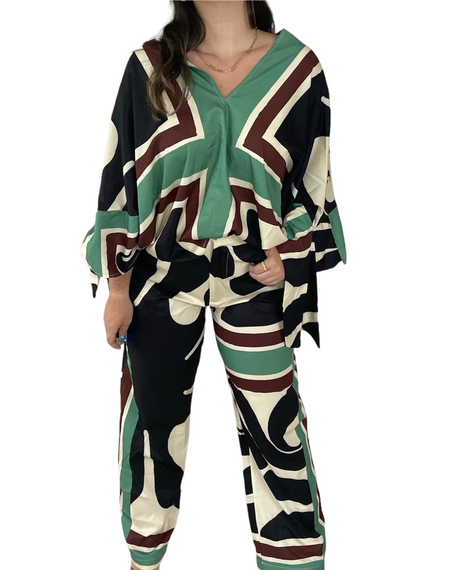 2-Piece Set : V Neck Blouse with bow tie on sleeve and Wide Leg Pants